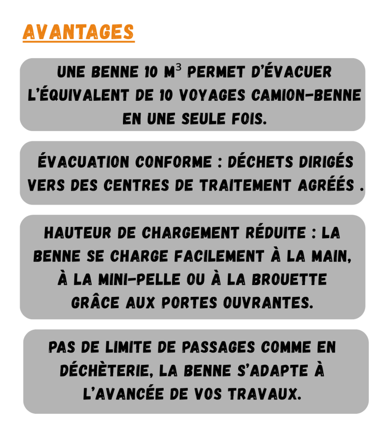 Prêt à évacuer vos déchets de chantier avec efficacité ? Contactez-nous dès aujourd’hui pour réserver votre benne 15m³ ou obtenir un devis personnalisé.